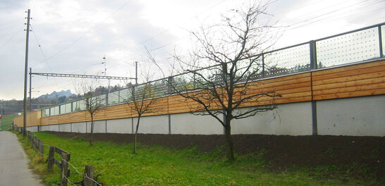 The laminated safety glass is screen-printed to protect the birds. The wall itself consists of a closed formwork on the resident side, a pressure impregnated frame construction as well as a mineral wool insulation, which is finally covered with a cement-bonded wood wool board. Only for aesthetic reasons was additional lamella formwork hung in front. The section of the noise barrier between the railroad line and the main road is absorbent on both sides and helps to redesign the station square.