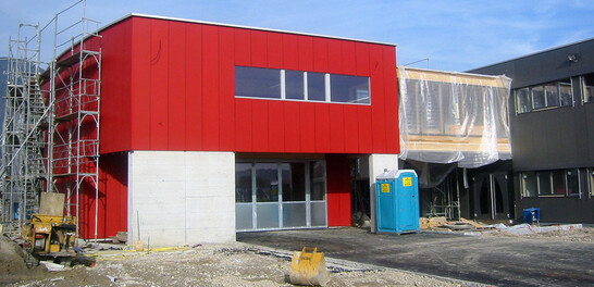 The annex building, called Dubai, has a round facade and is used for research and development purposes. The building envelope was completely prefabricated as elements in the factory and could thus be assembled within a very short time. The main supporting structure, which carries the roof loads in a 6.80 m grid, consists of a glulam beam with a cross-section of 200 x 100 mm and corresponding glulam posts. Roof and gallery floor elements are made of glued laminated timber ribs and three-layer panel planking as a composite box. The facades of both parts of the building were clad with special moisture-resistant particleboard (Formboard), which was cut and drilled at the factory using laser technology. The glass surfaces were designed with mullion-transom glazing. In order to bring daylight into the interior of the building, a skylight strip has been implemented on the roof. The flat roof waterproofing was prefabricated and installed quickly after erection, so that weather influences could be largely reduced.