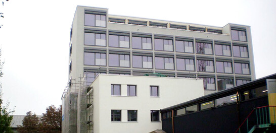 An L-shaped, 4-story extension was built over the existing 3-story commercial building. Construction method: Steel-concrete skeleton construction with non-load-bearing facade elements in timber construction.
