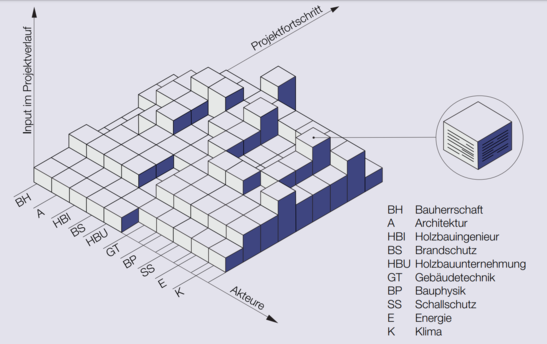 Based on the idea that in this approach the «noise» of the interface problems of current BIM - projects can be eliminated, new structures for a future real-time, cross-company and collaborative planning in timber construction have been exploratively and tested in Living Labs. In parallel, a performance matrix was developed that provides guidance on how architects and specialist planners can manage progress of a project in prefabricated timber construction in a concerted manner that is appropriate for timber construction.