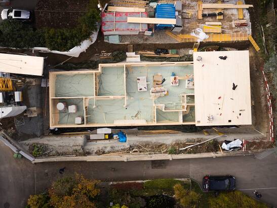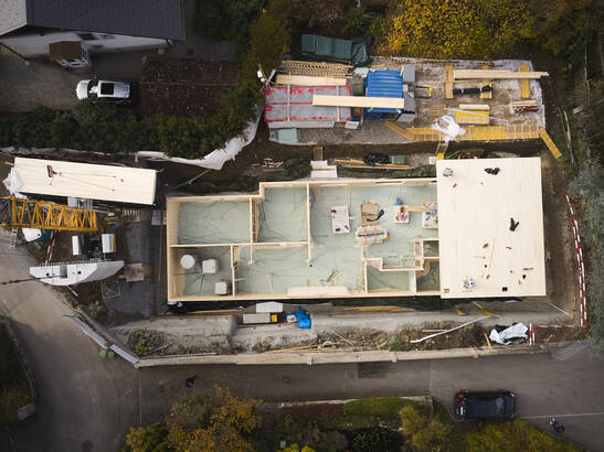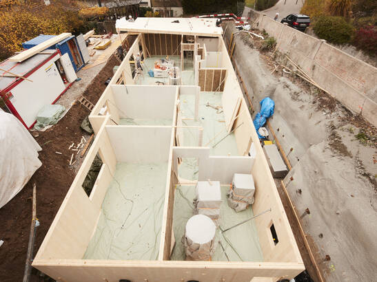 Basements made of wood are not only good for the environment. They are also built much faster. For the project in Thun, 98 days were enough to construct the timber basement clean and dry and cover it with the floor slab. The erection work only took five days! The construction of a comparable basement in solid construction would have taken around 184 days. A timber basement can also compete with a concrete basement in terms of price.