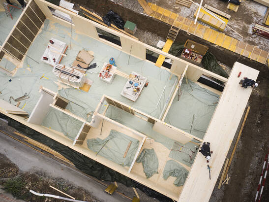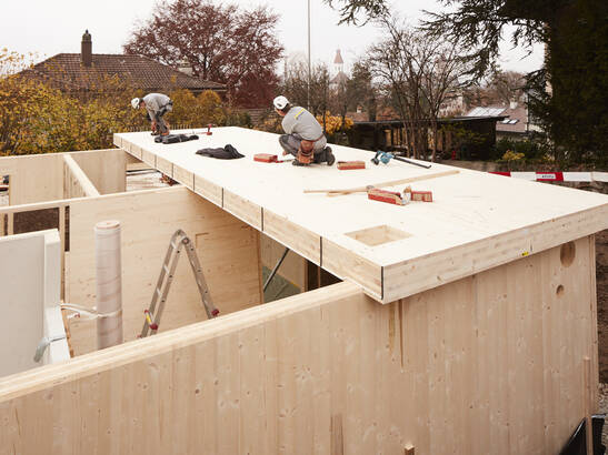 If you want to make a contribution to climate protection, you build with wood today. If we want to achieve climate neutrality by 2050, it makes sense to do without steel and concrete and rely on timber construction instead - even for basements. In an apartment building in Thun, a total of 222 tons of CO₂ are stored in the wood used - 126 tons of which are in the basement.