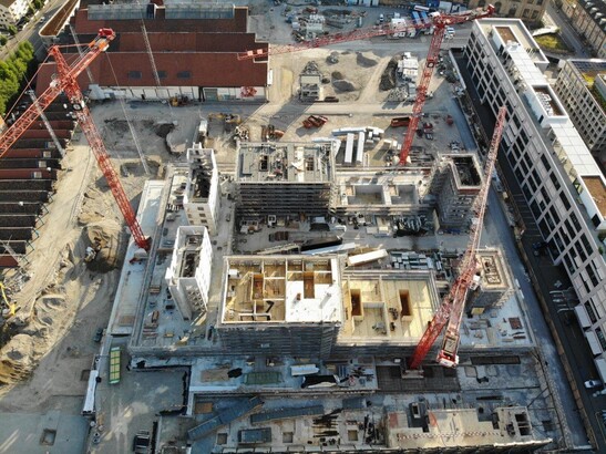Baustellenaufnahme der Arbeiten beim Holzhaus Krokodil mit über 250 Wohnungen.