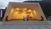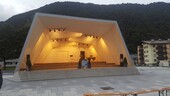 In Kirchdorf ist der Musikpavillon der letzte Baustein des neuen Bildungscampus. Er ist ein frei stehender und von allen Seiten sichtbarer Solitär mit der Bühne nach Süden und einer Bushaltestelle für den Schülerbus nach Norden.Das Faltwerk aus massiven Holzplatten wurde aus seinen akustischen Erfordernissen heraus entwickelt. Der Schall soll einerseits zum Publikum geleitet werden, andererseits müssen sich die Musiker gegenseitig hören, um zusammen spielen zu können.