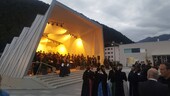 In Kirchdorf ist der Musikpavillon der letzte Baustein des neuen Bildungscampus. Er ist ein frei stehender und von allen Seiten sichtbarer Solitär mit der Bühne nach Süden und einer Bushaltestelle für den Schülerbus nach Norden.