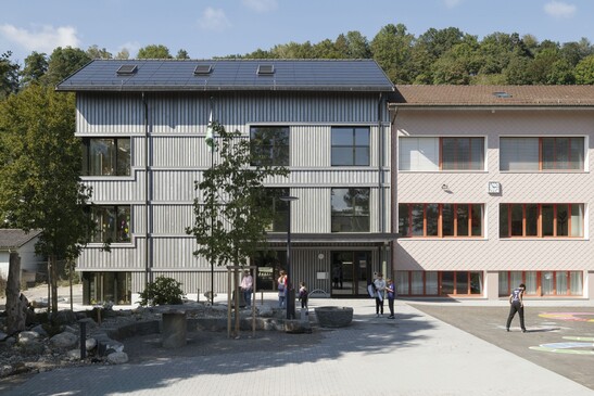Bei dieser Schulhauserweiterung waren speziell die unterschiedlichen Höhenversätze der Geschosse im Längs- wie Querschnitt vom Bestands- in den Neubau eine anspruchsvolle Herausforderung.