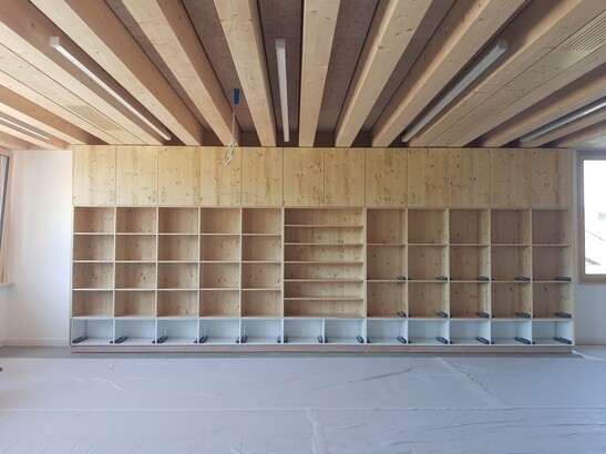 Die Klassenräume ab dem ersten Stock wurden in Mischbauweise Holz-Beton-Verbund realisiert - die Bodenplatte auf dem Erdgeschoss besteht aus Stahlbeton. Isolierte Holzelemente bilden eine vertikale Stütze für die Decken, die horizontal durch die Außenwände aus Stahlbeton über eine Bewehrung zur Verbindung mit der Betonkonstruktion stabilisiert werden. In die Aussenwände eingeschobene Hüllenelemente verkleiden die Fassade als Ergänzung zum Beton.