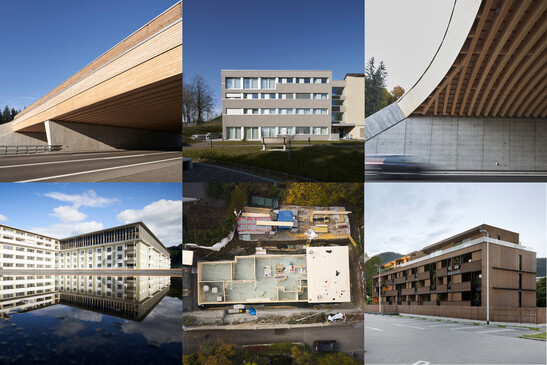 D'en haut à gauche dans le sens des aiguilles d'une montre : Wildtierbrücke Neuenkirch, Hôpital RFSM à Fribourg, Pont de la faune Rynetel, Immeuble d'habitation à Kufstein (AT), immeuble d'habitation avec cave en bois à Thoune, surélévation Parc de la Berna à Deisswil