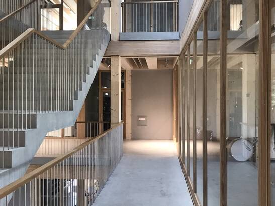 La nouvelle école combine la construction en bois massif et la construction à ossature habilement : Tous les planchers et une partie des murs intérieurs pour le contreventement du bâtiment sont construits en bois massif de bois lamellé-collé. Les autres murs intérieurs sont des cadres non porteurs. constructions à ossature. Les surfaces chaudes des murs et des plafonds en bois, ainsi que le l'échange permanent entre le bois et l'humidité de l'air créent un bon climat intérieur. climat intérieur. Des murs bien isolés sont importants : en effet, plus la différence entre la température de surface des murs, des sols et des plafonds et celle de l'air ambiant. température de l'air, plus il fait bon vivre dans une pièce. C'est pourquoi nous nous sentons dans les bâtiments en bois bien isolés, même lorsque la température est un peu plus basse. température ambiante. Les bâtiments peuvent ainsi être exploités de manière plus économe en énergie. De plus, la température Le bois donne l'impression d'avoir une température de surface plus élevée que le béton, l'acier ou le verre, ce qui Le bien-être est encore plus grand.