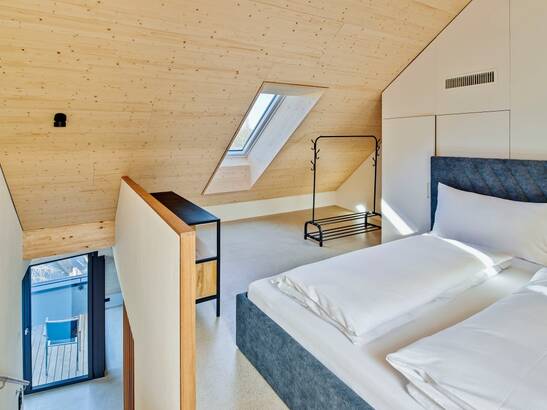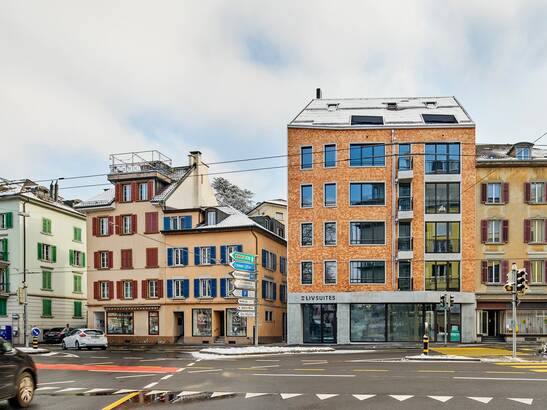 Les Liv Suites, situées dans un immeuble en bois de sept étages au cœur de la ville de Lucerne, offrent une expérience de vie moderne. La façade en bardeaux attire le regard. Des essais de résistance au feu ont permis de réaliser le revêtement continu en mélèze sans tabliers ni barres coupe-feu gênants.