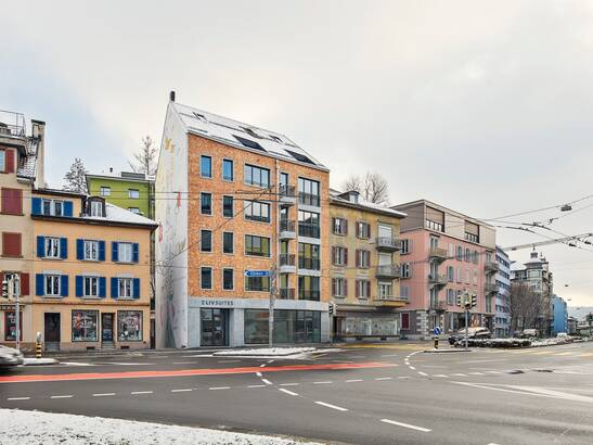 La façade de la Maihofstrasse est construite selon les mêmes principes, les conditions générales de la maison Wolf et du bâtiment Liv Suites sont comparables : Façade ajourée avec fenêtres superposées, pas d'angles intérieurs, distances réglementaires par rapport aux bâtiments voisins, couverture incombustible au niveau du socle, emplacement au milieu de nouveaux bâtiments qui correspondent également à l'état de la technique et façade entretenue. Les résultats des tests d'incendie d'Andermatt ont donc pu être utilisés pour la construction à Lucerne et ont permis de réaliser la façade en bardeaux du bâtiment Liv Suites.