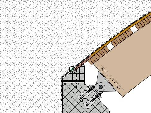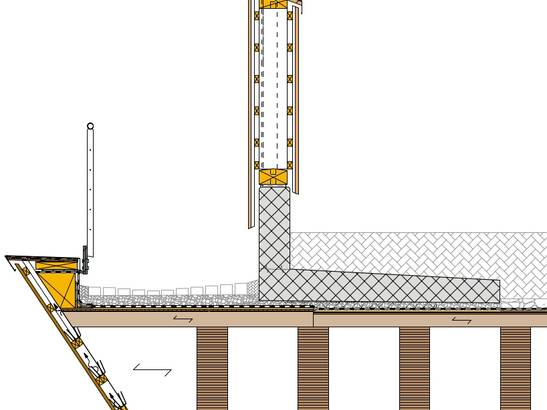 En raison d'un apport excessif d'humidité, associé à un mauvais comportement au séchage, le bois peut être attaqué en peu de temps par la pourriture ou les insectes. Des étanchéités multicouches et une couche de drainage protègent le recouvrement en bois contre l'eau d'infiltration. L'eau de surface provenant de la pulvérisation des véhicules doit s'écouler le plus librement et le plus rapidement possible. Pour ce faire, un espace suffisamment grand est aménagé entre les supports en béton et les éléments de construction en bois. Ainsi, les zones d'appui sont bien entourées d'air et peuvent sécher. Un revêtement en bois remplaçable et ventilé par l'arrière pour le revêtement du portail protège la construction sous-jacente des intempéries et des embruns des véhicules.