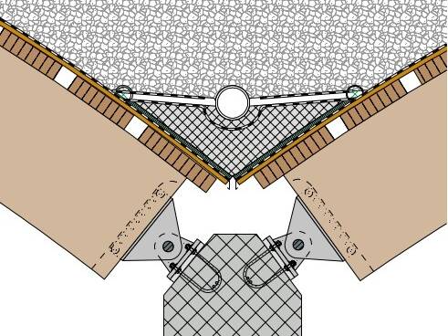 Les 156 poutres en arc en bois lamellé-collé d'une section de 240 x 760 millimètres et les murs en béton jouent ensemble : les forces latérales exercées sur les murs en béton sont absorbées par la construction en bois en forme d'arc. Les fermes en arc s'appuient à leur tour horizontalement et verticalement sur les murs en béton. Des articulations en acier relient les fermes en bois aux murs en béton coulé sur place de 80 centimètres d'épaisseur. Les propriétés de soutien du sol ont été modélisées avec des appuis à ressort et des constantes de ressort calculées.