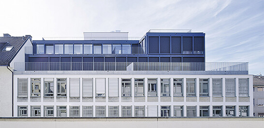 Afin d'obtenir des surfaces vitrées aussi grandes et libres que possible, des poteaux en acier visibles particulièrement étroits ont été installés du côté de la pièce où se trouve la façade. Le renforcement des surélévations s'est fait par le biais de la cage d'escalier en construction massive. Les nouvelles zones de toit plat sont conçues comme des terrasses accessibles et offrent une vue magnifique sur la ville et le lac de Zurich.