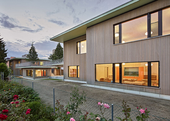 Les architectes zurichois ont conçu un projet comprenant cinq bâtiments indépendants : deux bâtiments à deux étages avec chacun deux jardins d'enfants pour un total de cent enfants, un pavillon pour les enseignants et deux petits bâtiments annexes. Pour leur projet, les architectes ont entièrement misé sur le bois comme matériau de construction. Ce matériau présente de nombreux avantages. D'une part, les salles de classe en bois sont très conviviales, d'autre part, le bois crée une atmosphère confortable et agréable. De plus, la durée de construction a pu être réduite au minimum grâce à la construction en bois.