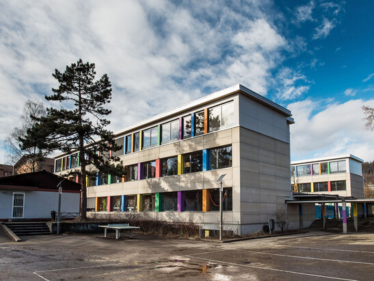 Les bâtiments existants, construits en dur dans les années 1950, ne pouvaient supporter qu'une charge limitée. Les nouveaux étages des ailes C et D du bâtiment scolaire ont donc été entièrement construits en ossature bois afin de pouvoir maintenir les charges à un faible niveau.