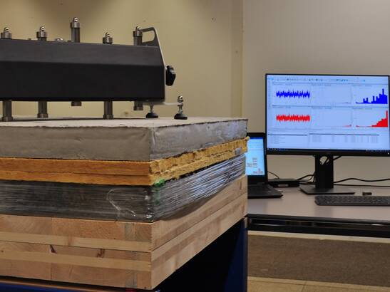 Pour nos clients, nous testons dans notre banc d'essai de bruits d'impact des structures de sol innovantes avec des mesures comparatives. Le banc d'essai des bruits d'impact est le résultat de plusieurs travaux de bachelor à la Haute école spécialisée bernoise de Bienne.