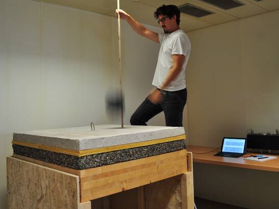 Avec le banc d'essai de bruit de choc, nous mesurons la modification de la protection contre le bruit de choc par l'adaptation de certaines couches. Dans cet exemple, une structure de sol éprouvée sert de variante de référence. Dans deux variantes, une couche est modifiée à chaque fois et l'influence sur les valeurs d'isolation acoustique et le bilan écologique est analysée.