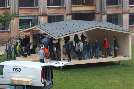 Despite the rain, around about 100 interested people, among them architects, students, representatives of the TS3 and Timbatec, as well as participants in the S-WIN conference "From research to practice From research to practice: new solutions for timber construction".