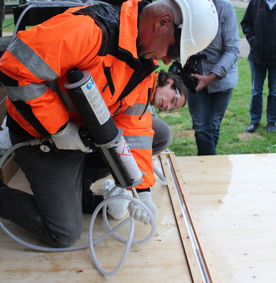 After the speeches of Stefan Zöllig, Managing Director of TS3, and BFH Professor Steffen Franke, those present witnessed how the world's first wooden balcony was glued on the front side. was glued.