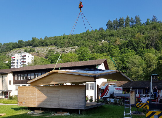 The new TS3 technology enables large surfaces made of wood. Ten years of research together with the Bern University of Applied Sciences and the ETH Zurich was to develop the technology. An important milestone was the long-term test stand in the courtyard of the Bern University of Applied Sciences in Biel. It has served well and and has now been dismantled.
