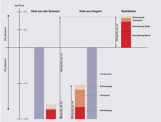 Of course, the production, transport and disposal of glulam also generate CO₂ emissions: One cubic meter of glulam for exterior use, made from Swiss wood, emits 190 kg of CO₂. If the wood comes from Hungary and is processed in Austria, emissions of 442 kg CO₂ can be expected. However, the cross-laminated timber solution is better than reinforced concrete - regardless of the origin of the wood. The bottom line is that 810 kg or 558 kg of the greenhouse gas are stored net per cubic meter of glulam used - reinforced concrete emits 434 kg of CO₂. The emission difference between reinforced concrete and glulam from Switzerland is 1244 CO₂ per cubic meter.