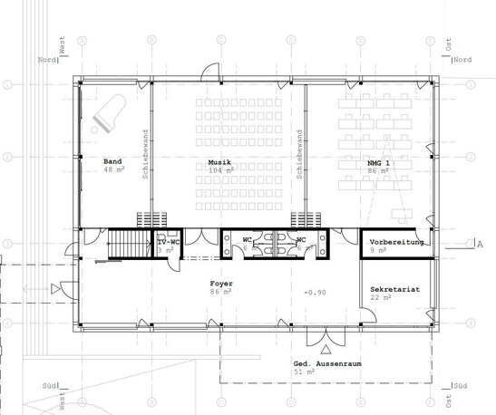 The work and group rooms, as well as the spacious school kitchen, face north. school kitchen are oriented to the north. On the one hand, this allows a view of the On the other hand, the rooms are less warm in summer. On the warmer south side, with a view of the neighboring buildings, are the access zones and the foyer. access zones and the foyer. The almost 240 m² large multi-purpose room on the first floor can be divided into three separate rooms with two sliding walls. rooms. This allows maximum flexibility of use for the school building.