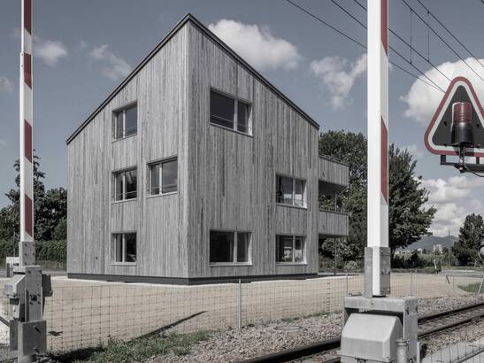 The advantages of the timber construction method are clearly visible and noticeable: The stately building was erected in just one week. The very short construction time made it possible to dispense with costly safety measures along the railroad tracks. Inside, the colorlessly glazed wooden ceilings provide a pleasant living atmosphere. On the outside, the wooden building shines with a back-ventilated, silver-grey pigmented wooden formwork. The restrained color scheme gives the new building a contemporary architectural expression and creates associations with traditional timber construction.