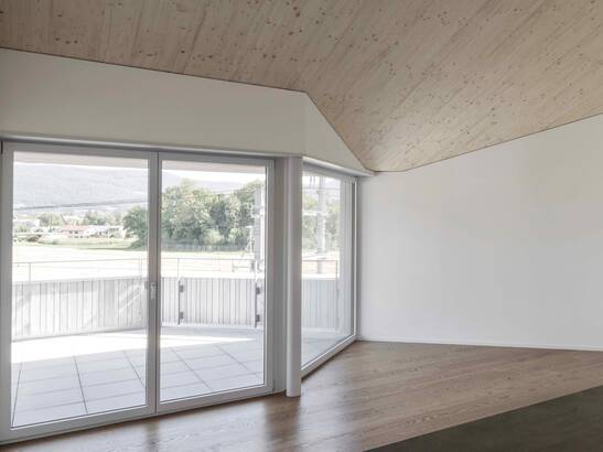 The new apartment building in Buchs AG combines the advantages of timber construction and solid construction. The wooden floor slabs, which are only 39 centimeters thick, rest on filigree supports - beams are not necessary. Thus, the large rooms and window fronts are not impaired by disturbing cross beams. This is possible thanks to TS3 technology.