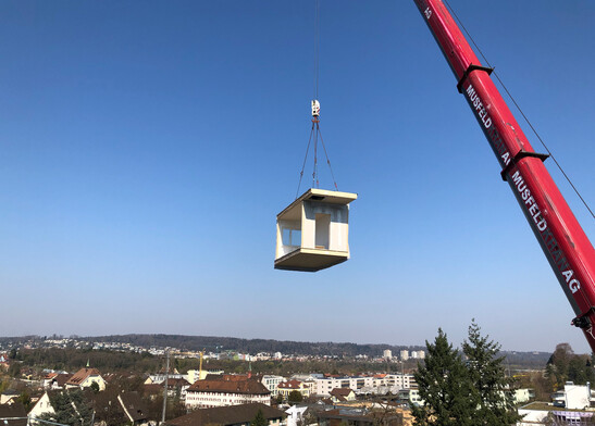 During several weeks, carpenters from Stamm Bau AG produced 28 wooden modules. They can be manufactured with millimeter precision on the factory floor - a level of accuracy that would would not be possible on the construction site. In just one day, the crane lifts all the modules to lofty heights. lofty heights. The craftsmen assemble the wooden modules on the flat roof of the existing the wooden modules on the flat roof of the existing west wing. In doing so, they create space for new office rooms in the Dornach Hospital.