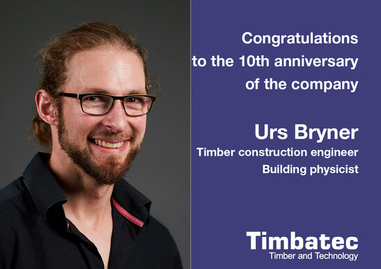 Congratulations on the company's 10th anniversary. Urs Bryner, timber construction engineer and building physicist. All team members of the Timbatec family are proud of you and thank you for your co-operation.