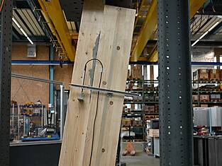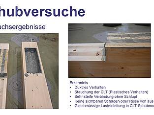 The connection between the CLT walls and the timber chords is made via so-called shear cams, which are milled directly out of the cross laminated timber in the longitudinal direction. These cams transfer the shear forces positively into the load-bearing system. The performance of these cams has been impressively demonstrated by extensive tests at ETH Zurich: A single cam can absorb shear forces of up to 30 tons.