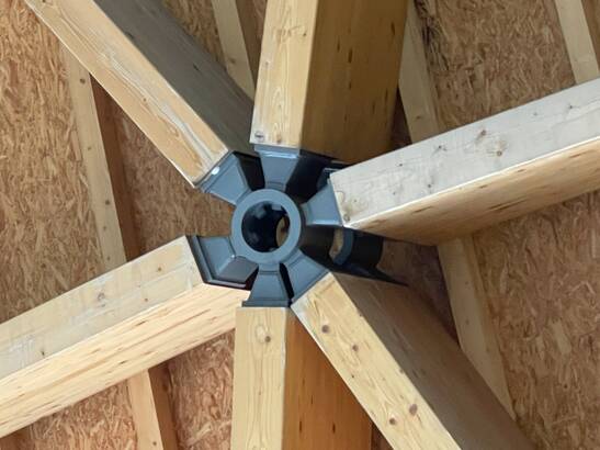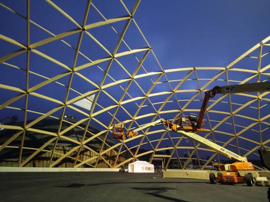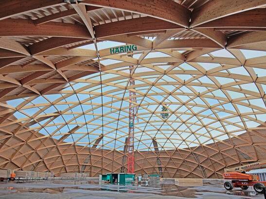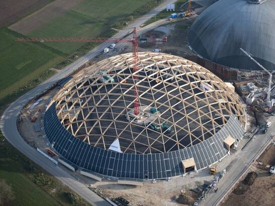 The individual elements of the dome are joined together at the ends by a patented connection system (central tube) made of hexagonal steel nodes (326 in total). Starting from the 48 precisely measured binder shoes in the concreted tension ring (circumference: 377 m), the prefabricated, equilateral triangular elements (side length: 9.5 m) were assembled in layers and with maximum work safety. The dimensional stability of glulam and the systematic, self-controlling geometry enabled smooth, accident-free cantilevering using mobile telescopic work platforms: The dome structure was erected in six weeks, the roof area covers around 14,000 m² and is roughly the size of two football pitches. High-tech wood technology at its best.