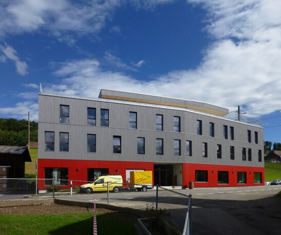 Due to the small distances between the buildings, individual exterior walls had to be constructed as fire walls and therefore in concrete. These concrete slabs were additionally used for earthquake bracing. Steel was used for beams and columns. The majority of the exterior walls, on the other hand, were made of prefabricated timber elements. OLWO also wanted a wooden solution for the building ceilings. Due to the large spans, a high-performance ceiling system had to be found. Hollow box elements from Lignatur were chosen. Together with the subfloor and an elastically bonded fill, these Lignum elements meet both the required sound and fire protection. For the OLWO building, approximately 470 m3 of solid wood, glued laminated timber and derived timber products were used for the OLWO building. Over 80 percent of the wood used comes from Swiss forests. The building has therefore received an award of the label "Herkunftszeichen Schweizer Holz HSH".