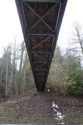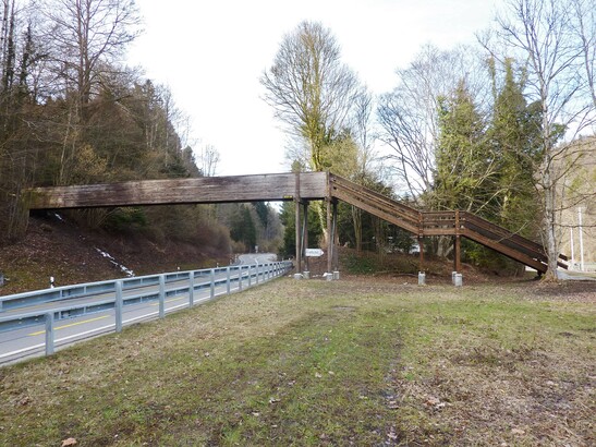 The aging pedestrian bridge crosses the Sihltalstrasse and connects the Sihlwald train station with the Zurich Wilderness Park. It is the only crossing over this busy road in the immediate vicinity. The park covers around twelve square kilometers, is home to over 300 wild animals and attracts over half a million visitors each year.