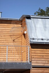 For the exterior walls, the decision was made in favor of a timber frame construction. All apartment partition walls consist of a 2-layer cross laminated timber construction. The ceilings were realized with 16 cm thick cross laminated timber elements. A form-fitting, horizontally arranged larch formwork was installed as the facade. Sufficient distance to the underlying timber frame planking ensures a sufficiently dimensioned rear ventilation cross-section. The asymmetrical roof was realized with a wooden beam construction with a rear ventilation level. For the roof terraces, the flat roof was made with cross laminated timber elements.