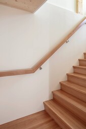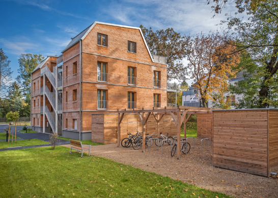 Architecturally, the materials form a symbiosis with the forest behind. The 20 residential units were built according to the KFW 40 standard and each has a balcony or terrace. The apartments of the two residential buildings can be accessed via exterior staircases and arcades. On a base of reinforced concrete, 390 m3 wood was installed on a reinforced concrete base, both in the supporting structure and in the interior and facade areas.