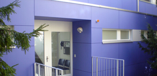 In the front part of the building, elevated point supports were concreted directly onto the retaining wall. All load distribution to the foundations is provided by a steel girder grid supported by the floor elements of the first floor. The superstructure above was built using conventional frame construction, with the interior walls being non-load-bearing. Special attention was required for the fire protection concept and the escape routes, all of which had to be strictly adhered to. The facade of cement-bonded particleboard (nbb) takes into account the distances between buildings, which in some cases were below standard. A two-meter projecting wall bar prevents a fire from spreading to the window front at the smallest building distance.