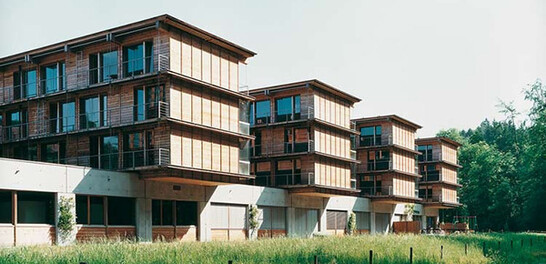 In the end, the project was carried out in a wooden element construction system. The element size is matched to each room; a measure for better sound insulation between the rooms. The balconies are suspended from the outside with steel rods on single or double girders.